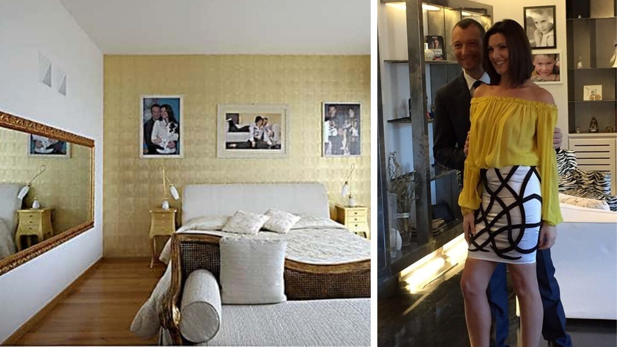 Le pareti sono perlopiù bianche e in tutte le stanze c’è un parquet scuro che garantisce al salone un senso di calore. Non mancano alle pareti foto della coppia che si mostra sempre affiatata e innamorata, sia in camera da letto che nel grande salone dove c’è un grande divano bianco. Nella parete davanti al divano c’è una grande televisione circondata da due nicchie sfruttate come scaffali su cui campeggiano foto e oggetti. La zona pranzo, divisa dalla zona living da un muro divisorio a vista, ha un grande tavolo in legno e vetro con sedie colorate e una vista sulla città. Chi si intende di design può notare che ci sono alcuni elementi d’arredo, come le poltrone, che in base ai rivestimenti molto probabilmente appartengono all’artista e designer Fornasetti.