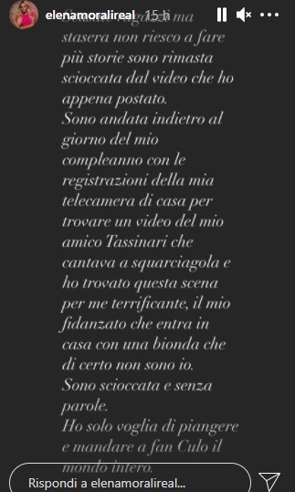 “Scusate ragazzi ma stasera non riesco a fare più storie, sono rimasta scioccata dal video appena postato – scrive Elena – Sono andata indietro al giorno del mio compleanno con le registrazioni della mia telecamera di casa per trovare un video del mio amico Tassinari che cantava a squarciagola e ho trovato questa scena per me terrificante, il mio fidanzato che entra in casa con una bionda che di certo non sono io. Sono scioccata e senza parole. Ho solo voglia di piangere e mandare a fan*ulo il mondo intero”.