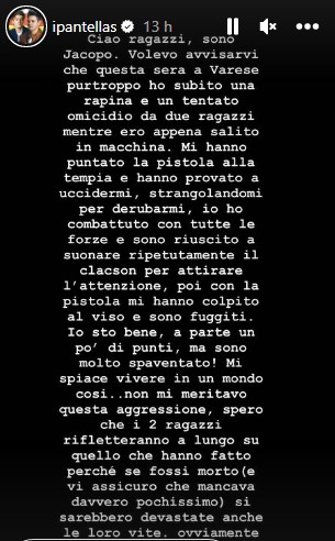 “Ciao ragazzi, sono Jacopo – ha scritto – Volevo avvisarvi che questa sera a Varese purtroppo ho subito una rapina e un tentato omicidio da due ragazzi mentre ero appena salito in macchina”. “Mi hanno puntato la pistola alla tempia e hanno provato ad uccidermi, strangolandomi per derubarmi – ha proseguito – Io ho combattuto con tutte le forze e sono riuscito a suonare ripetutamente il clacson per attirare l’attenzione, poi con la pistola mi hanno colpito al viso e sono fuggiti”.