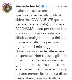 “RIPETO: come d’altronde avevo anche specificato per iscritto sotto il video (ma OVVIAMENTE quella parte è stata tagliata); il mio era SARCASMO usato per rispondere in modo pungente contro chi alludeva malignamente a fini che nuocevano alla mia persona riguardanti il mio soggiorno a Dubai con domande offensive ed irrispettose – ha precisato tra i commenti sotto la clip rilanciata da “Trashbiccis” – Non capisco, gli altri possono permettersi di insultarmi gratuitamente senza conoscermi e senza nemmeno sapere di cosa parlano mentre io, cittadina di un paese libero, non ho diritto a rispondere a tono e per di più con il sorriso facendo una battuta scherzosa? (Sempre per chi ha l’arguzia di coglierla ovvio)”.