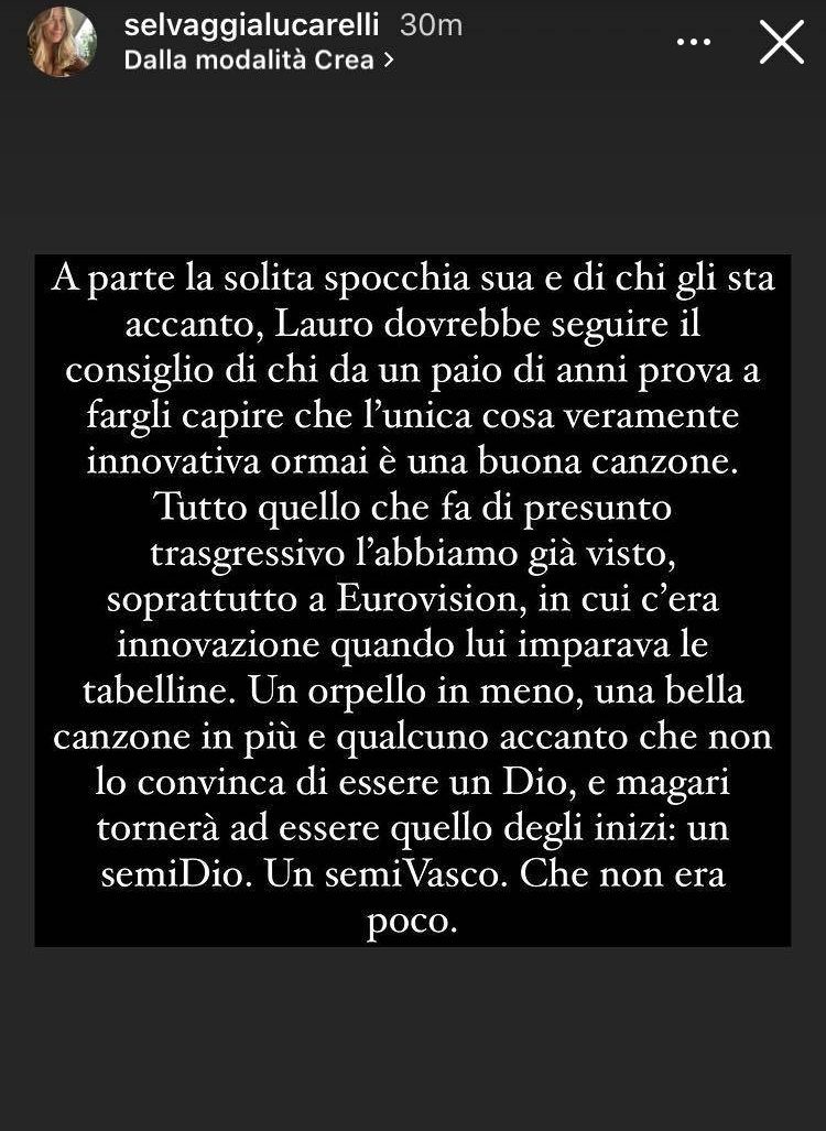 “A parte la solita spocchia sua e di chi gli sta accanto – scrive la giornalista tra le Instagram Stories – Lauro dovrebbe seguire il consiglio di chi da un paio di anni prova a fargli capire che l’unica cosa veramente innovativa ormai è una buona canzone. Tutto quello che fa di presunto trasgressivo l’abbiamo già visto, soprattutto a Eurovision, in cui c’era innovazione quando lui imparava le tabelline. Un orpello in meno, una bella canzone in più e qualcuno accanto che non lo convinca di essere un Dio, e magari tornerà a essere quello degli inizi: un semiDio. Un semiVasco. Che non era poco”.