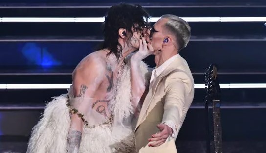 Quindi al braccio del suo chitarrista Boss Doms, anche lui vestito di bianco e con il velo da sposa, ha sceso le scale sulle note della marcia nuziale in versione rock. Una volta approdati sul palco, i due si sono baciati rievocando l’esibizione sanremese dello scorso anno. Lauro ha infatti proposto i brani portati all’Ariston negli anni scorsi: “Me ne frego” e “Rolls Royce”.
