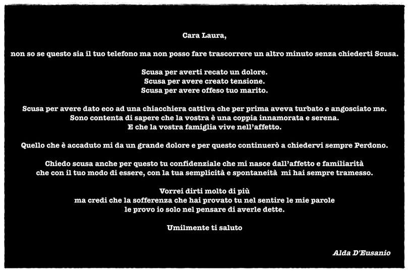 Quello che è accaduto mi dà un grande dolore e per questo continuerò a chiedervi sempre Perdono – aveva aggiunto – Chiedo scusa anche per questo tu confidenziale che mi nasce dall’affetto e dalla familiarità che ho con il tuo modo di essere, con la tua semplicità e spontaneità che hai sempre trasmesso. Vorrei dirti molto di più, ma credi che la sofferenza che hai provato tu nel sentire le mie parole la provo io nel pensare di averle dette. Umilmente ti saluto