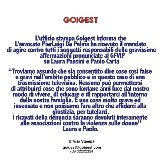“Troviamo assurdo che sia consentito dire cose così false e gravi nell’ambito pubblico e in questo caso di una trasmissione televisiva – avevano tuonato i due in una nota congiunta diffusa dopo la raccapricciante boutade di Alda D’Eusanio – Nessuno può permettersi di attribuirci cose che sono lontane anni luce dal nostro modo di vivere, di educare e di rapportarci all’interno della nostra famiglia. È una cosa molto grave ed insensata e non possiamo fare altro che affidarci alla giustizia, per tutelarci. I ricavati della denuncia saranno devoluti interamente alle associazioni contro la violenza sulle donne”. Nel frattempo, la conduttrice ha portato Mediaset in tribunale (LEGGI QUI).
