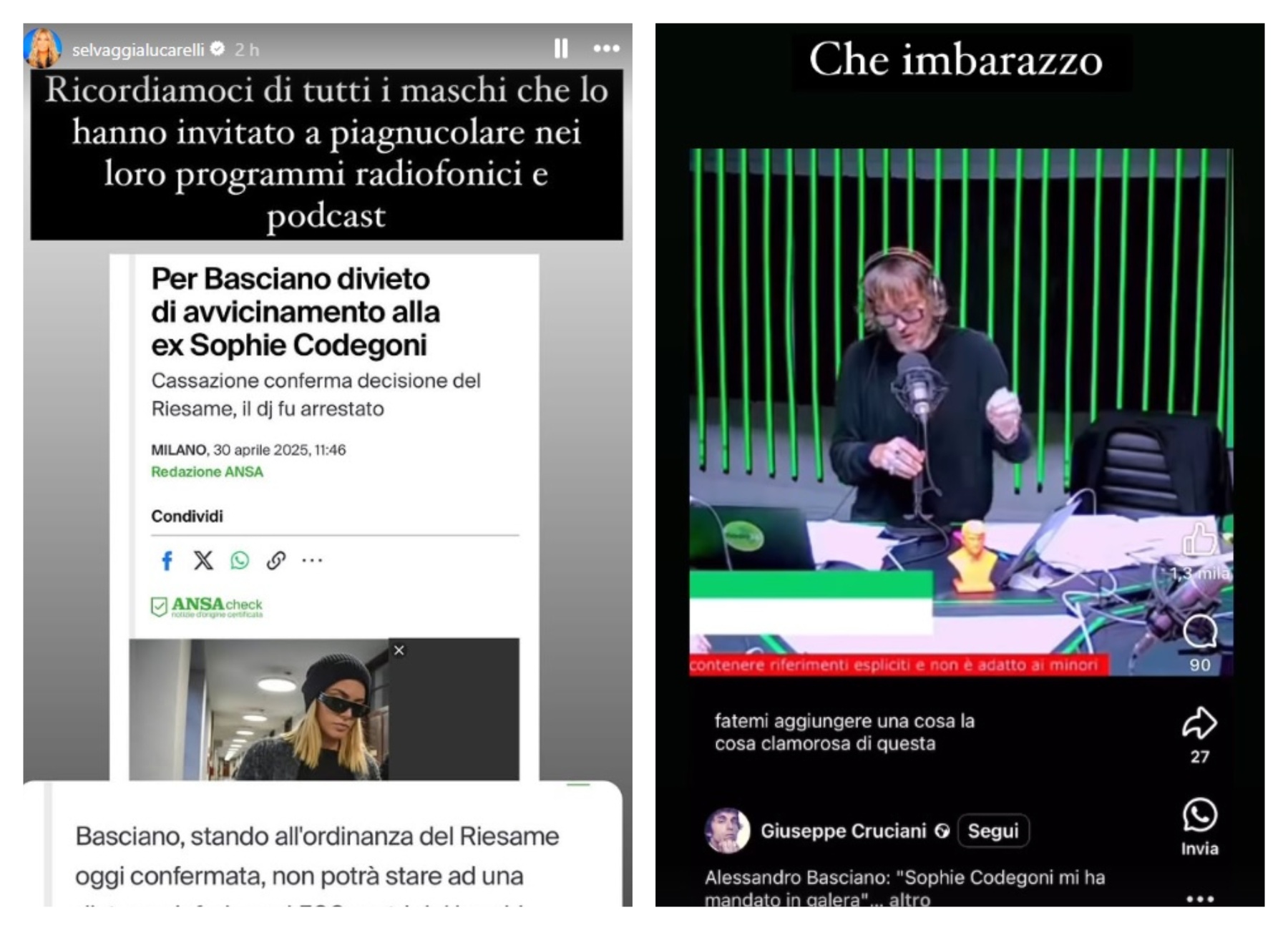 Selvaggia Lucarelli ha così commentato in una Instagram Story la sentenza della Cassazione che confermato il divieto di avvicinamento al dj obbligandolo ad indossare il braccialetto elettronico: “Ricordiamoci di tutti i maschi che lo hanno invitato a piagnucolare nei loro programmi radiofonici e podcast”. La penna del “Fatto Quotidiano” si riferisce, in particolare, a Fabrizio Corona e a Giuseppe Cruciani.
