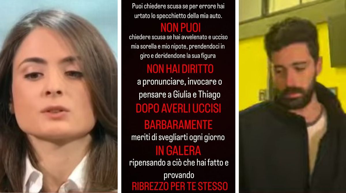 A poche ore dall’udienza e dalla parole pronunciate in aula da Alessandro Impagnatiello è arrivata la reazione di Chiara Tramontano, che in una storia di Instagram ha scritto: “Puoi chiedere scusa se per errore hai urtato lo specchietto della mia auto. Non puoi chiedere scusa se hai avvelenato e ucciso mia sorella e mio nipote, prendendoci in giro e deridendone la sua figura. Non hai diritto a pronunciare, invocare o pensare a Giulia e Thiago. Dopo averli uccisi barbaramente meriti di svegliarti ogni giorno in galera ripensando a ciò che hai fatto e provando ribrezzo per te stesso”. Parole che non lasciano spazio al perdono. Il legale della famiglia della vittima al termine dell’udienza ha dichiarato che le scuse dell’ex barman “sopraggiungono a distanza di sette mesi. Il signor Impagnatiello non si è reso responsabile un gesto estemporaneo, ma ha propinato per mesi veleno topicida alla compagna e al proprio figlio” .