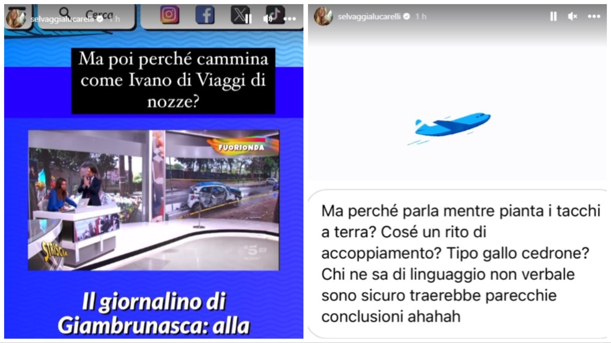 “Vabbè ma è il personaggio dell’anno – è il commento di Selvaggia Lucarelli – Ma poi perché cammina come Ivano di ‘Viaggi di nozze’?”. La penna del “Fatto Quotidiano” ha rilanciato le domande di un utente curioso di capire meglio il personaggio Giambruno: “Ma perché parla mentre pianta i tacchi a terra? Cos’è? Un rito di accoppiamento? Tipo gallo cedrone? Chi ne sa di linguaggio non verbale sono sicuro trarrebbe parecchie conclusioni. Ahahahah”.