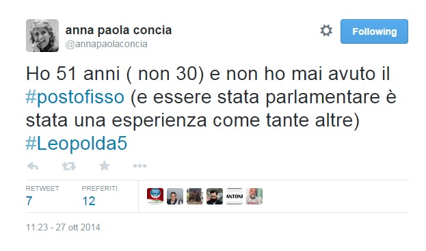 “Ho 51 anni ( non 30) e non ho mai avuto il posto fisso (e essere stata parlamentare è stata una esperienza come tante altre)”, twitta Anna Paola Concia indignando i suoi follower. “No sei lo standard o la gente media”, “Beh no. essere parlamentare della Camera non è esattamente “una esperienza come tante altre” per mille motivi”, “Un’esperienza che però ti frutta un bel vitalizio. Non è ancora meglio del #postofisso? #ipocriti” , “Caspita, quasi un precariato“, “Dove posso donare soldi per aiutarla?”, sono solo alcuni commenti all’uscita poco felice dell’ex parlamentare del Pd.