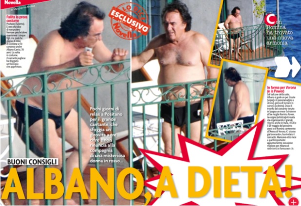 Prova costume impietosa per Al Bano, immortalato dai paparazzi sulla terrazza della sua camera d’albergo a Positano. Non è chiaro se il cantante indossi un costume o un paio di boxer. Le foto pubblicate da “Novella 2000” svelano comunque un fisico appesantito e un girovita esagerato al punto che il settimanale lo invita senza metti termini a mettersi a dieta.