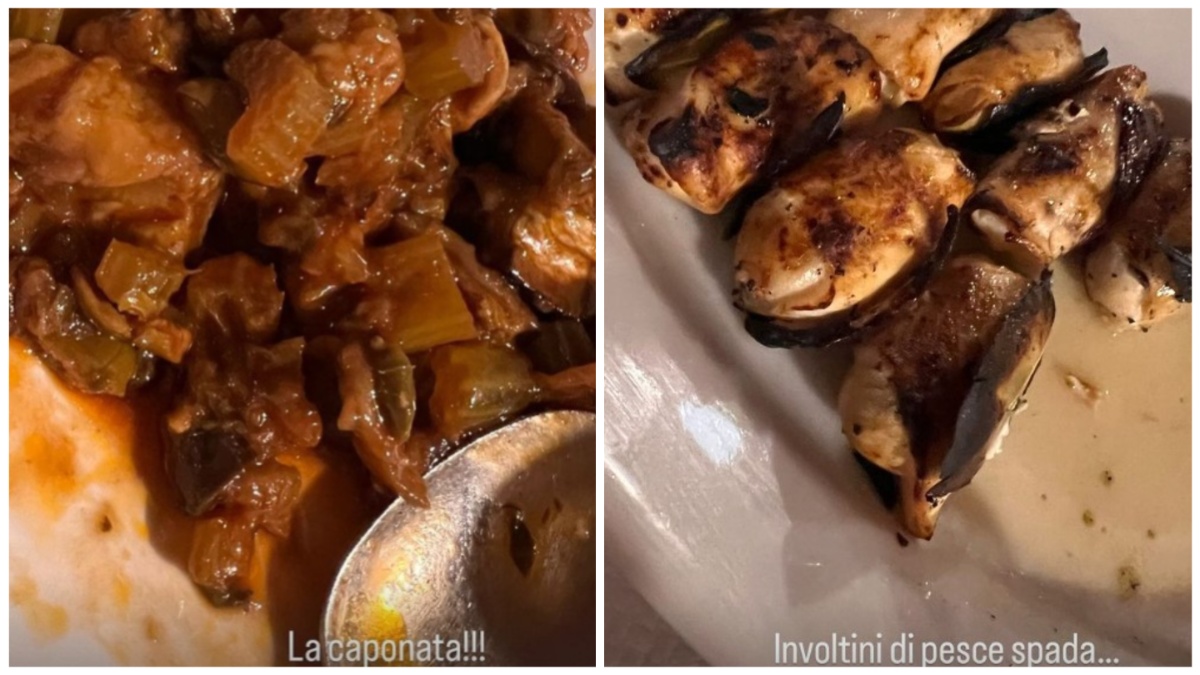 A pranzo la conduttrice si è spostata da Don Ciccio a Bagheria, una trattoria dove ha degustato alcune specialità locali. Dall’antipasto uovo sodo e zibibbo alla pasta con le sarde con la mollica tostata, dalle sarde a beccafico alla caponata fino agli involtini di pesce spada.