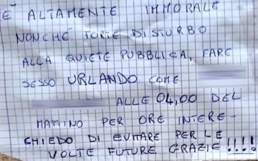 “E’ altamente immorale nonché forte disturbo alla quiete pubblica fare sesso urlando come alle 04,00 per ore intere. Chiedo di evitare per le volte future. Grazie”. E’ l’appello rivolto da un anonimo residente di una palazzina ubicata nel centro storico di Frascati ad una coppia di amanti focosi che disturba il sonno degli altri condomini.