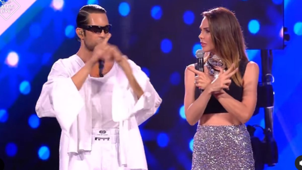 Ma i siparietti non sono finiti qui. Dopo la scoppiettante esibizione di Mahmood, Ilary Blasi ha concesso il bis. Il cantante si è presentato sul palco con un look minimal. Dopo l’indimenticabile copricapo di finta pelliccia indossato sul palco del “Tim Summer Hits”, ha scelto un outfit total white: canotta, camicia spalancata, calzoncini, calzini bianchi sopra al ginocchio e ginocchiere in tinta. I boxer oversize con l’elastico decorato riportavano il logo di Luis De Javier, il brand che ha firmato il look. Il cantante si è esibito in un medley infiammando la piazza con “Tuta Gold” e “Ra Ta Ta”. Al termine dell’esibizione è arrivata la conduttrice per salutare l’artista e ha confessato che, nonostante la figlia abbia provato a insegnarle la coreografia del pezzo, lei ancora non la sa ballare. Mahmood ha provato a insegnargliela, ma Ilary Blasi ha rinunciato esclamando: “Ciao core!”. Poi una battuta sul look: “Mahmood, ma è più facile scrivere una canzone di successo o scegliere l’outfit per venire a cantare?”. Il cantante molto divertito ha risposto: “Volevo mettere una cosa semplice, e invece no”. “Na cosetta te sei messo!”, chiude Ilary Blasi tra le risate di tutti.