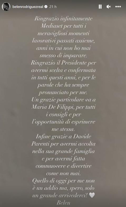 A questi commenti è seguita una Instagram Story in cui Belen Rodriguez ha ringraziato l’azienda di Cologno Monzese per gli anni trascorsi insieme. “Ringrazio infinitamente Mediaset per tutti i meravigliosi momenti lavorativi passati assieme, anni in cui non ho mai smesso di imparare – ha affermato – Ringrazio il Presidente per avermi scelta e confermata in tutti questi anni, e per le parole che ha sempre pronunciato per me. Un grazie particolare a Maria De Filippi, per tutti i consigli e per l’opportunità di esprimere me stessa. Infine grazie a Davide Parenti per avermi accolta nella sua grande famiglia e per avermi fatta commuovere e divertire come non mai. Quello di oggi per me non è un addio ma, spero, solo un grande arrivederci”.