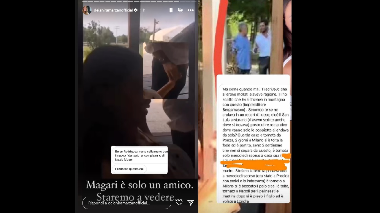 Nelle scorse ore, il colpo di scena. La gossippara Deianira Marzano ha pubblicato tra le Stories lo screenshot di una segnalazione appena ricevuta. Secondo una gola profonda, Belen Rodriguez frequenterebbe da una quindicina di giorni un imprenditore bergamasco. L’uomo risponderebbe al nome di Elio e i due avrebbero trascorso dei momenti all’insegna del romanticismo in montagna. L’imprenditore avrebbe partecipato alla festa di compleanno di Ignazio Moser dove, secondo l’insider, teneva per mano la showgirl argentina. Deianira Marzano invita a prendere con le pinze il racconto e sottolinea che potrebbe trattarsi di un amico.