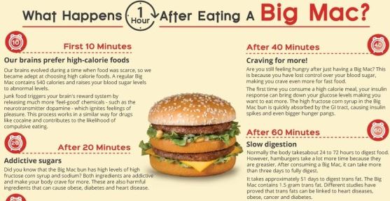 Dopo 20 minuti: gli zuccheri che creano dipendenza. Sapevi che il Big Mac ha alte concentrazioni di “sciroppo di glucosio fruttosio” (High Fructose Corn Syrup) e di sodio? Entrambi gli ingredienti possono creare dipendenza e portare il tuo corpo a desiderare sempre di più quel cibo. Gli stessi ingredienti possono, alla lunga, esporre il soggetto al rischio di diabete, obesità e problemi cardiaci.