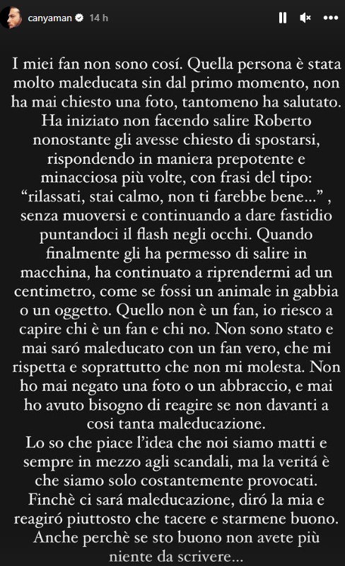 Can Yaman ha rotto il silenzio e ha dato la sua versione dei fatti via social. “I miei fan non sono così – ha scritto in una Instagram Story – Quella persona è stata molto maleducata sin dal primo momento, non ha mai chiesto una foto, tantomeno ha salutato. Ha iniziato non facendo salire Roberto nonostante gli avesse chiesto di spostarsi, rispondendo in maniera molto prepotente e minacciosa più volte, con frasi del tipo: ‘rilassati, stai calmo, non ti farebbe bene…’ senza muoversi e continuando a dare fastidio puntandoci il flash negli occhi. Quando finalmente gli ha permesso di salire in macchina, ha continuato a riprendermi ad un centimetro, come se fossi un animale in gabbia o un oggetto”.
