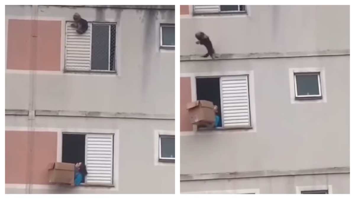 Mentre i passanti urlavano e riprendevano la scena con il telefonino, una vicina di casa di nome Clarissa ha avuto un lampo di genio. Ha consegnato al portiere alcune coperte per attutire la caduta della Yorkshire. Poi ha preso una scatola di cartone che contiene i vestiti dei suoi figli e l’ha posizionata fuori dalla finestra in direzione della cagnolina. Alicinha non ce l’ha fatta più e si è lasciata cadere nel vuoto ma grazie al guizzo di Clarissa è finita proprio all’interno della scatola di cartone che ha retto al contraccolpo. La donna ha riconsegnato la cagnolina sana e salva alla sua famiglia.