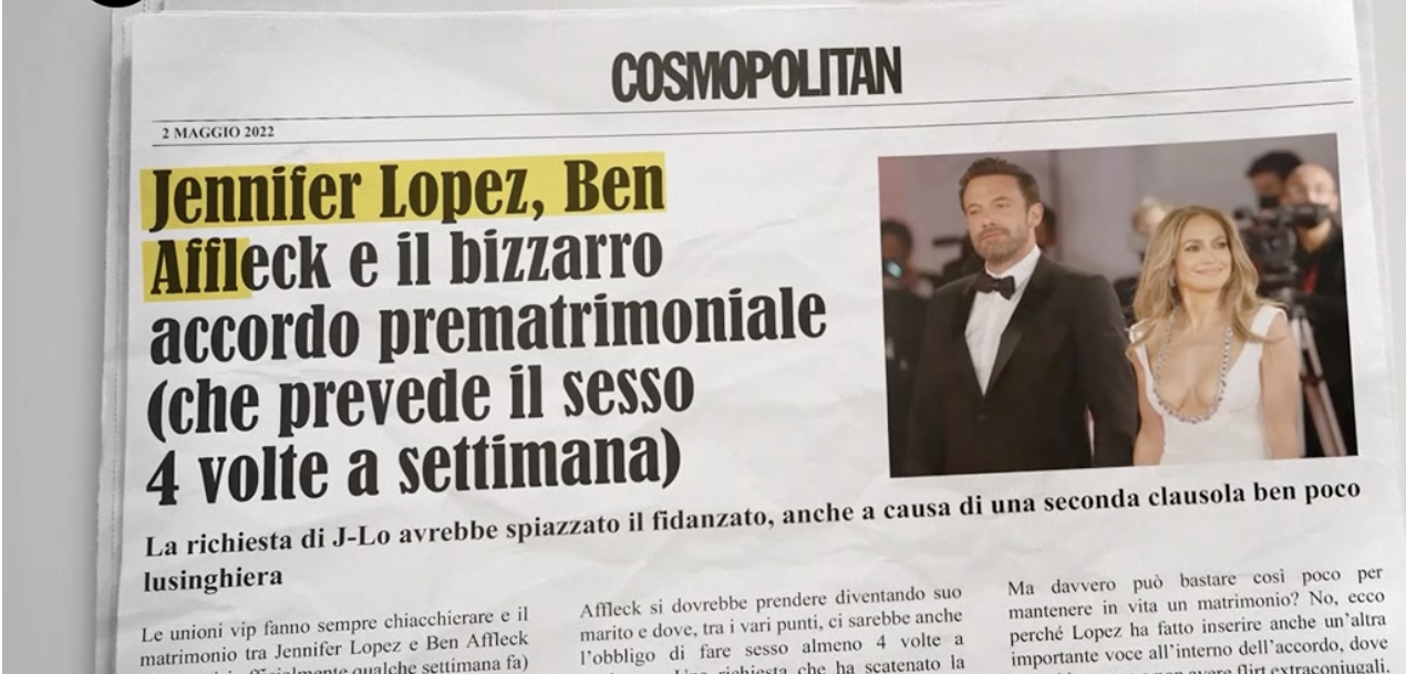 Prendendo spunto dall’accordo prematrimoniale tra Jennifer Lopez e Ben Affleck che secondo i rumors prevede che la coppia faccia sess0 quattro volte a settimana, “Le Iene” hanno sottoposto Cecilia Rodriguez e Ignazio Moser, i nonni influencer Faustino e Maria, Alessandro Cecchi Paone e il suo nuovo compagno Simone Antolini e gli ex gieffini Sophie Codegoni e Alessandro Basciano ad un questionario per condividere con i telespettatori i loro segreti più intimi.