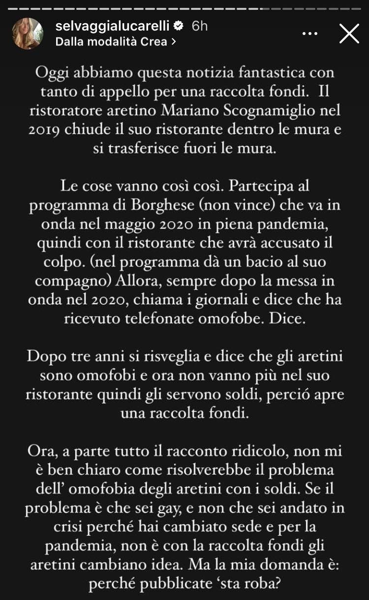 La storia di Mariano ha suscitato la reazione di Selvaggia Lucarelli. “Partecipa al programma di Borghese (non vince) che va in onda nel maggio 2020 in piena pandemia, quindi con il ristorante che avrà accusato il colpo – ha ricapitolato la giornalista in una Instagram Story – Nel programma dà un bacio al suo compagno. Allora, sempre dopo la messa in onda nel 2020, chiama i giornali e dice che ha ricevuto telefonate omofobe. Dice. Dopo tre anni si risveglia e dice che gli aretini sono omofobi e ora non vanno più nel suo ristorante, quindi gli servono soldi, perciò apre una raccolta fondi”.
