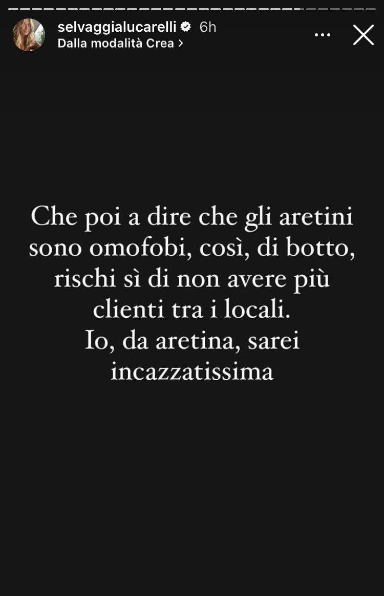 “Ora, a parte tutto il racconto ridicolo, non mi è ben chiaro come risolverebbe il problema dell’omofobia degli aretini con i soldi – ha affermato la Lucarelli – Se il problema è che sei gay, e non che sei andato in crisi perchè hai cambiato sede e per la pandemia, non è che con la raccolta fondi gli aretini cambiano idea”. “Che poi a dire che gli aretini sono omofobi, così, di botto, rischi sì di non avere più clienti tra i locali. Io, da aretina, sarei incaz**tissima”, ha aggiunto. “Ma pensa, je farebbero comodo 44.000 euro. Pure a me”, ha chiosato.