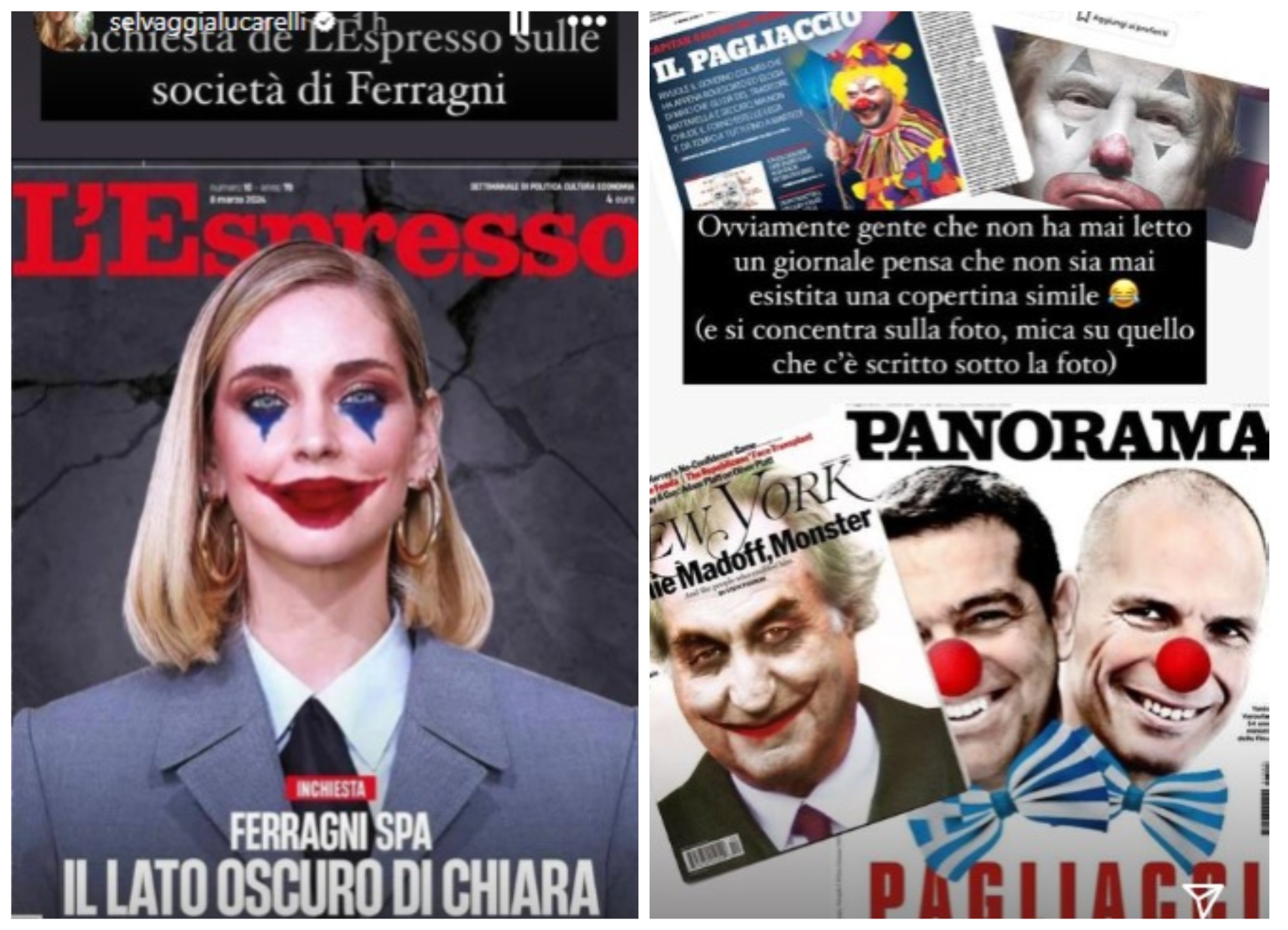 Selvaggia Lucarelli, che per prima ha sollevato il caso del pandoro rosa Balocco griffato da Chiara Ferragni, ha rilanciato tra le sue Instagram Stories la copertina de “L’Espresso” e a seguire una serie di cover dove altri personaggi venivano rappresentati come clown. “Ovviamente gente che non ha mai letto un giornale pensa che non sia mai esistita una copertina simile – sottolinea – (e si concentra sulla foto, mica su quello che c’è scritto sotto la foto)”.