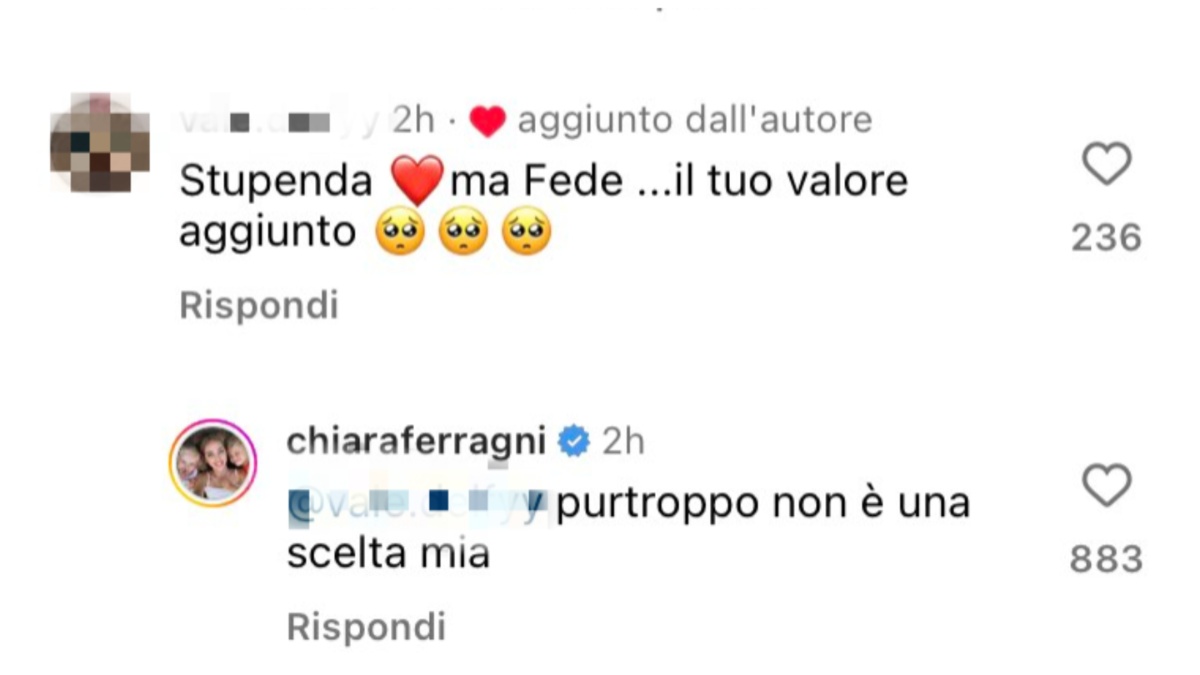 Adesso il commento di Chiara Ferragni che la dice lunga su “chi ha lasciato chi”. L’influencer si è immortalata nella stanza di un hotel della Grande Mela. “Stupenda ma Fede…il tuo valore aggiunto”, ha sottolineato una fan. “Purtroppo non è una scelta mia”, ha fatto sapere lei. Per poi aggiungere un cuore a un commento sul marito: “Federico dovrebbe ricordare quando lui ha avuto bisogno di te. I momenti belli sono facili da condividere”. “Si avvicinano i compleanni dei bimbi come vorrei che tutto tornasse come prima”, ha auspicato una follower. “Idem”, ha replicato Chiara Ferragni lasciando intendere che fosse per lei riunirebbe la famiglia.
