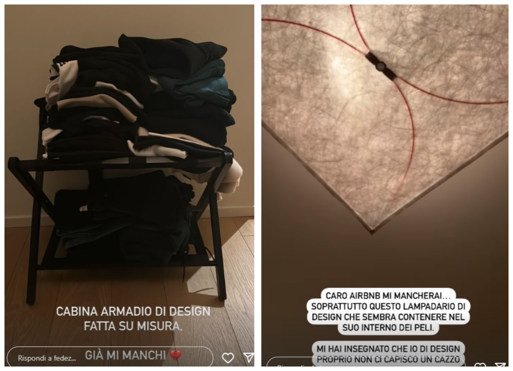 Fedez ha scherzato anche sulla casa che lo ha ospitato in quest’ultimo mese. “Caro Airbnb, mi mancherai – ha scritto in una Instagram Story – Soprattutto questo lampadario di design che sembra contenere nel suo interno dei peli. Mi hai insegnato che io di design proprio non ci capisco un ca**o”. Il cantante ha anche immortalato numerose buste di carta accatastate all’ingresso: “Questa è la mia vita riassunta in un frame. Sono tutte le cose che ordino da mangiare e poi le stipo lì, faccio la differenziata voglio sottolineare”. E poi quella che suona una frecciatina alla sua ex moglie. Il rapper ha condiviso la foto di uno sgabello pieno di vestiti. “Cabina armadio di design fatta su misura. Già mi manchi”, ha ironizzato.