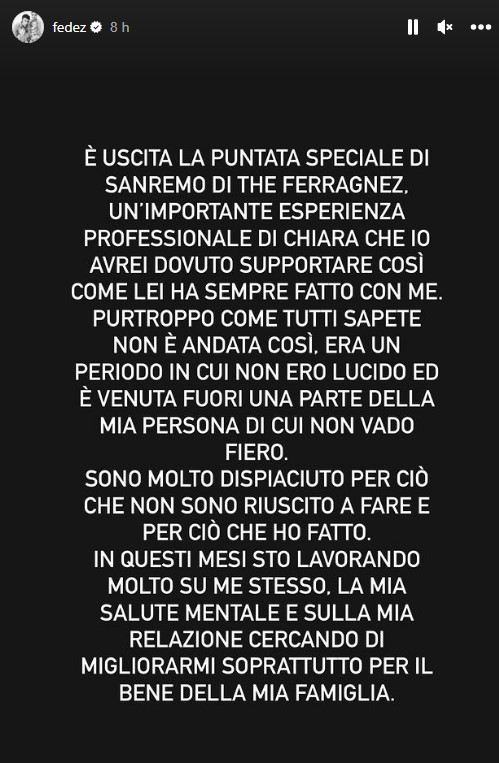 “È uscita la puntata speciale di Sanremo di The Ferragnez, un’importante esperienza professionale di Chiara che io avrei dovuto supportare così come lei ha sempre fatto con me – ha scritto nelle scorse ore Fedez in una Instagram Story – Purtroppo come tutti sapete non è andata così. Era un periodo in cui non ero lucido ed è venuta fuori una parte della mia persona di cui non vado fiero. Sono molto dispiaciuto per ciò che non sono riuscito a fare e per ciò che ho fatto. In questi mesi sto lavorando molto su me stesso, sulla mia salute mentale e sulla mia relazione cercando di migliorarmi soprattutto per il bene della mia famiglia”.