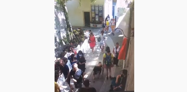 Un uomo a petto nudo si fa strada tra la folla a quattro zampe, portato al guinzaglio da un altro uomo come fosse un cagnolino. E’ la scena che si è presentata agli occhi di turisti e residenti che passeggiavano per le vie di Positano in una giornata estiva.