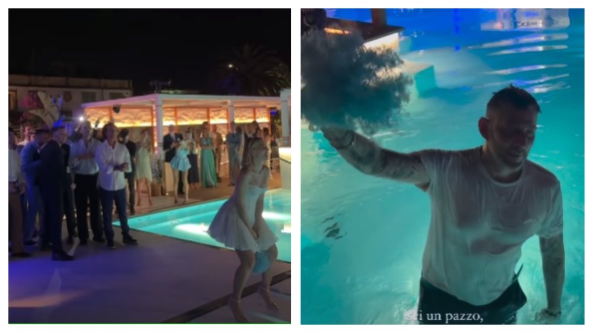 Edoardo Tavassi si tuffa in piscina dopo aver preso il bouquet