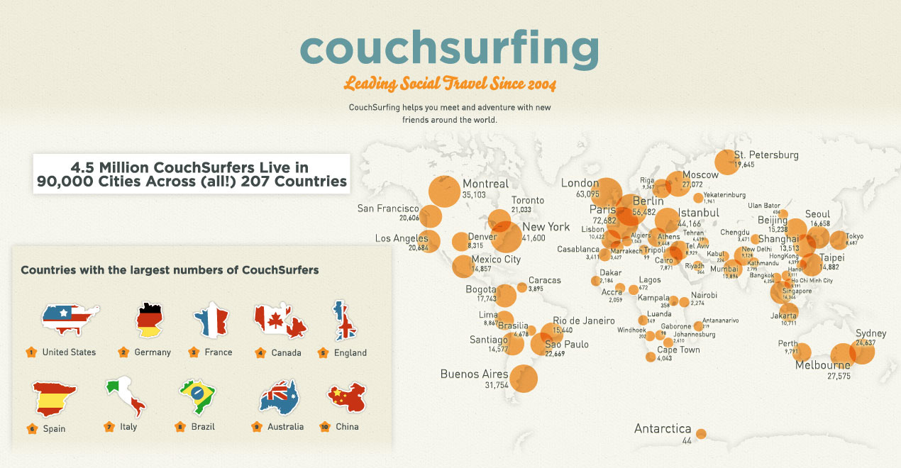 Il CouchSurfing, diventato ormai un network internazionale, annovera tra i suoi iscritti più di 4 milioni e mezzo di persone da tutto il mondo.Il sito ha deciso di rendere pubbliche delle statistiche attraverso una simpatica infografica, in cui viene descritto il comportamento dei membri del network.