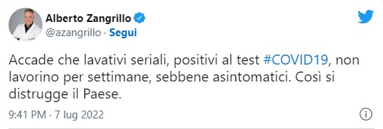 Alberto Zangrillo torna a far parlare di sé. Negli ultimi due anni, il direttore dell’Unità operativa di anestesia e rianimazione generale del San Raffaele di Milano si è sempre posto come una voce fuori dal coro in tema di coronavirus. Ieri il medico personale di Silvio Berlusconi ha lanciato un tweet che ha scatenato non poche polemiche. “Accade che lavativi seriali, positivi al test Covid–19, non lavorino per settimane, sebbene asintomatici. Così si distrugge il Paese”, ha scritto sollevando un vero e proprio polverone.