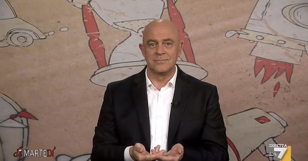 Nella consueta copertina di “DiMartedì”, Maurizio Crozza prende di mira il governo tecnico ed Elsa Fornero, per la riforma delle pensioni bocciata dalla Consulta, l’Italicum e la sua tormentata elezione. Il comico ligure ironizza anche sull’Expo: “C’è l’acqua che da verde diventa rossa, nei padiglioni ci sono cose incredibili: anche se di contenuti non c’è niente, ma le diapositive che si muovono… come si chiamano, sono i video, e tanti maxischermi che sembra di essere da Trony’. Crozza conclude il suo intervento imitando Renzi che canta a modo l’inno di Mameli: “Siam pronti alla morte l’Italia twittò”.