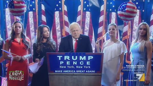 Maurizio Crozza porta sullo schermo un nuovo personaggio: Donald Trump, neo vincitore delle Presidenziali Americane. Il tycoon stenta ancora a credere di aver sconfitto Hillary Clinton: “Am I the new President? Don’t you stay coglionand me? I’ll be the President of ALL OF YOU… a part gay, sick and muslim…. For me the most important thing is… Foundation International Global of America… F.I.G.A.“.