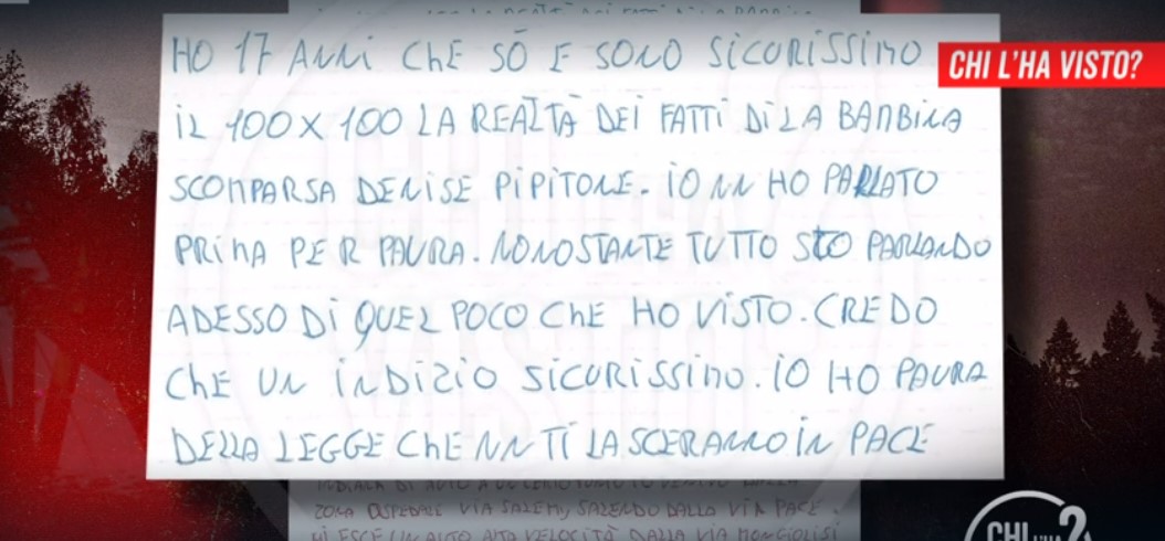 Il nome dell’ex fidanzato di Jessica Pulizzi compare in una lettera anonima ricca di dettagli spedita a Giacomo Frazzitta, legale di Piera Maggio, e al programma condotto da Federica Sciarelli. Nonostante l’appello di Frazzitta, l’anonimo non si è mai fatto avanti. Ieri sera, “Chi l’ha visto?” ha svelato il contenuto della missiva dove, oltre a Ghaleb, vengono indicate due donne i cui nomi sono stati censurati.