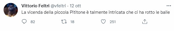 Unanime lo sdegno degli internauti. “L’ha scritto veramente?”, “No, era fuori di fronte casa e comunque non si deve infierire sui genitori!”, “Più o meno come i morti per il terremoto de L’Aquila. Anche la Pipitone se l’è cercata”, “Vergogna”, “Lei è pessimo”, “Questo è molto grave”, “Quando diventa così cinico è un po’ irritante”, “Questa schifezza potevi risparmiartela”, “… e probabilmente si vergognano di te e di ciò che scrivi”, “Lei mi piace molto caro Feltri, ma questa battuta è veramente troppo forte e, considerato che si parla di una bambina rapita e mai ritrovata, la poteva risparmiare! Inoltre anche se non dovessero ritrovarla, trovare i colpevoli sarebbe comunque la cosa più giusta!”, commentano alcuni utenti.
