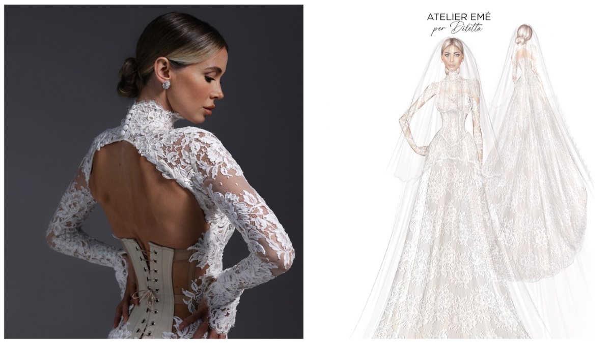 “Abbiamo realizzato per lei una creazione d’alta sartoria, un abito sensazionale in pizzo rebrodè dalle sofisticate geometrie floreali – si legge sull’account Instagram di Atelier Emé – Il corpino è disegnato meravigliosamente da collo alto e maniche lunghe, mentre il punto focale rimane senza dubbio il corsage accuratamente strutturato, che insieme alla gonna ampia in semitrasparenza, raccontano un ensemble di eleganza e d’innovazione della tradizione”.