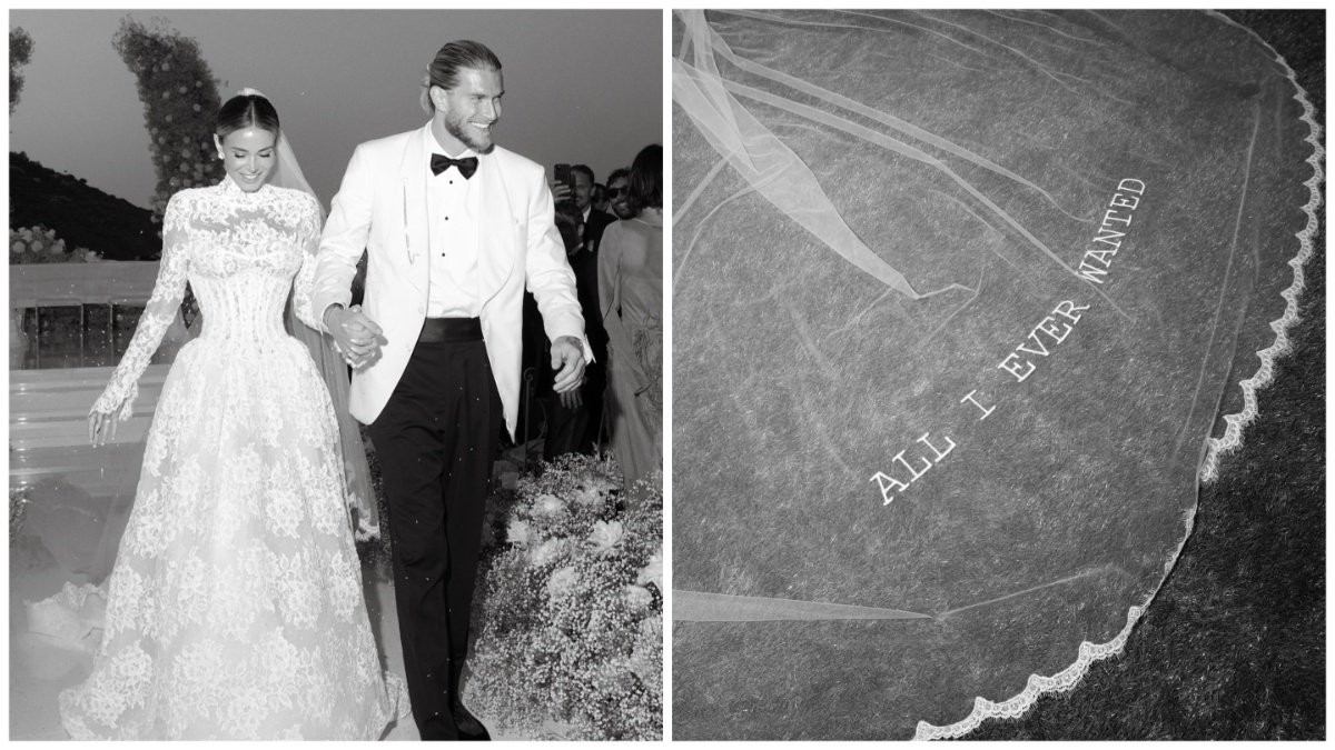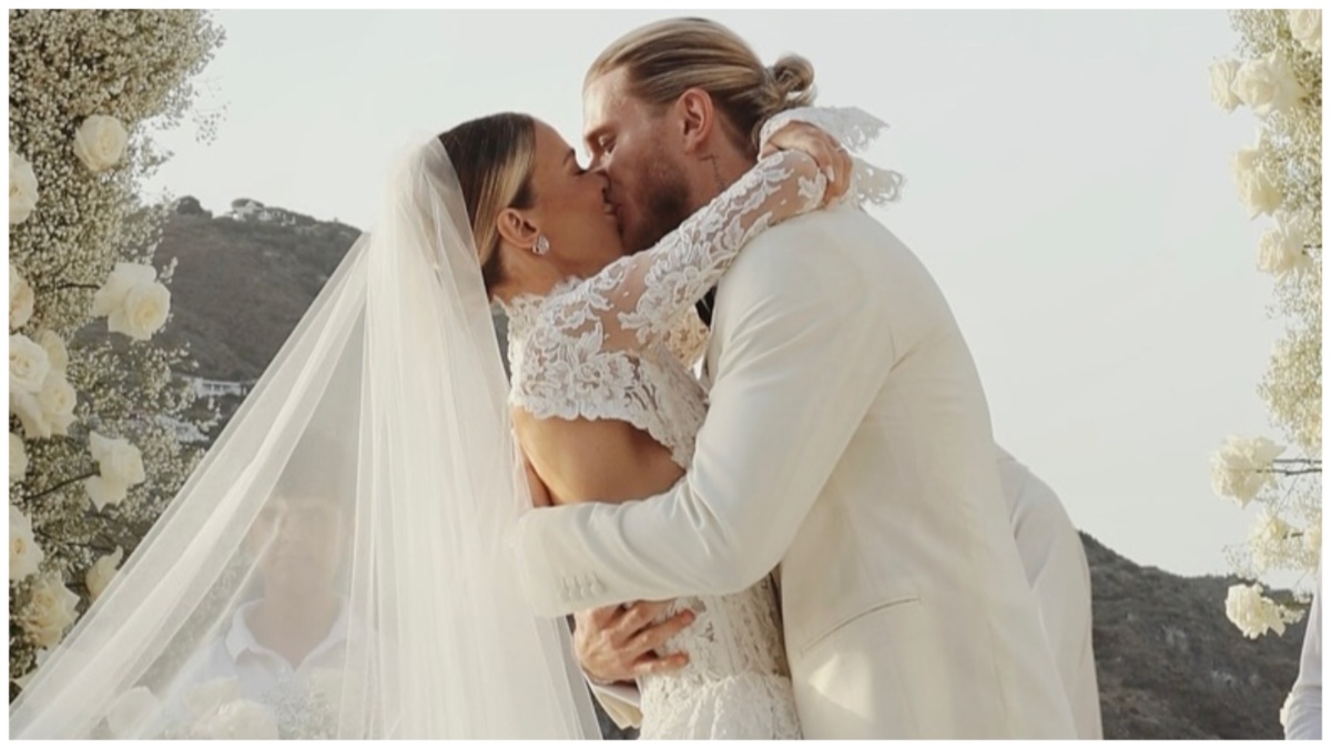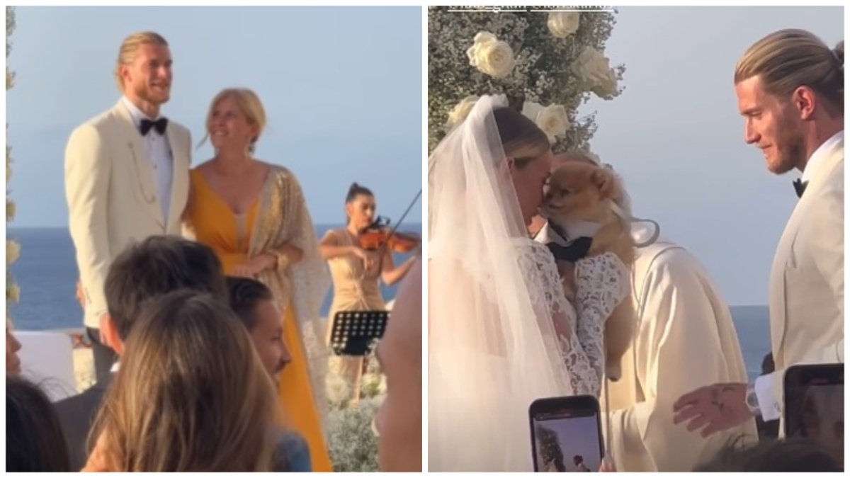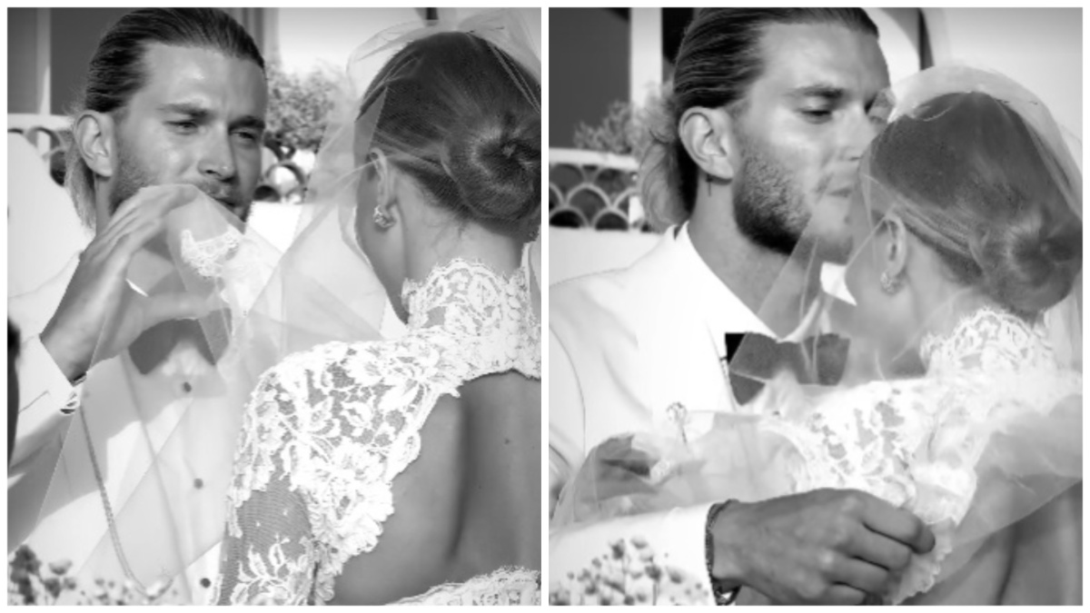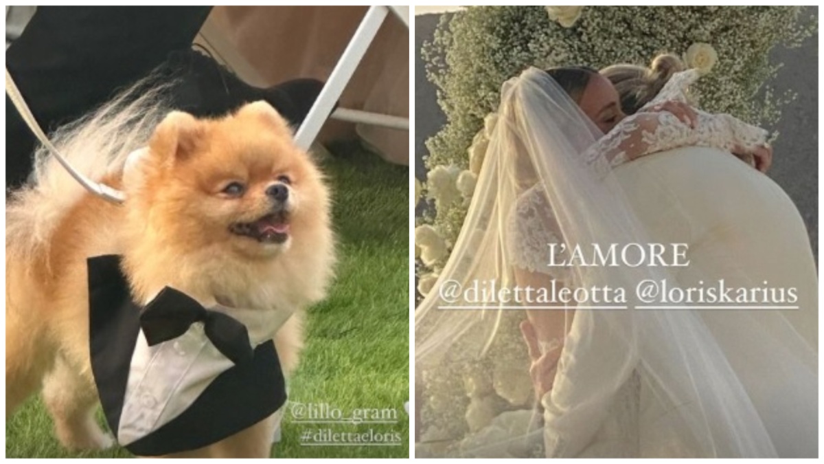 Loris Karius ha optato per uno smoking “spezzato”: giacca e camicia bianchi, pantaloni e papillon neri. Il calciatore ha sollevato il velo della sua sposa e l’ha baciata in fronte. A portare le fedi, Lillo, il cagnolino di Diletta Leotta.
