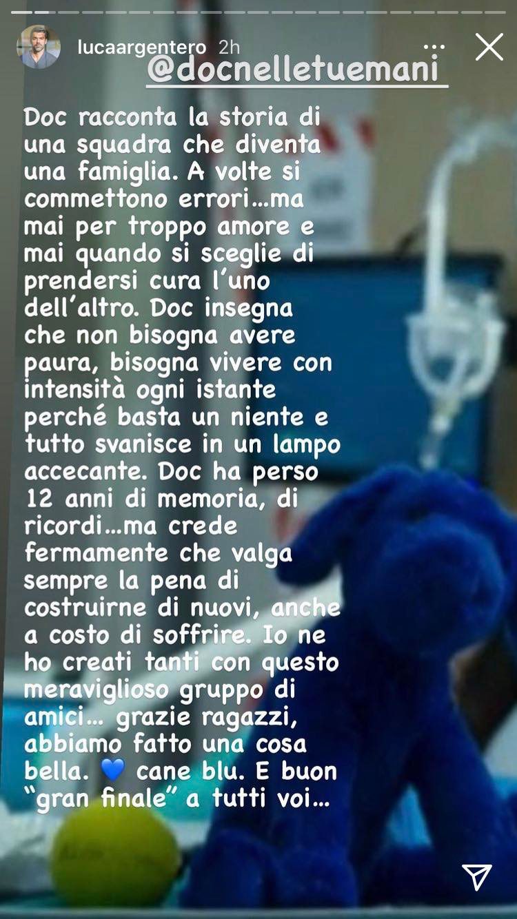 “Doc racconta la storia di una squadra che diventa una famiglia – ha scritto – A volte si commettono errori…ma mai per troppo amore e mai quando si sceglie di prendersi cura l’uno dell’altro. Doc insegna che non bisogna avere paura, bisogna vivere con intensità ogni istante perché basta un niente e tutto svanisce in un lampo accecante. Doc ha perso 12 anni di memoria, di ricordi…ma crede fermamente che valga sempre la pena di costruire di nuovi, anche a costo di soffrire. Io ne ho creati tanti con questo meraviglioso gruppo di amici. Grazie ragazzi, abbiamo fatto una cosa bella. Cane blu. E buon ‘gran finale’ a tutti voi”.