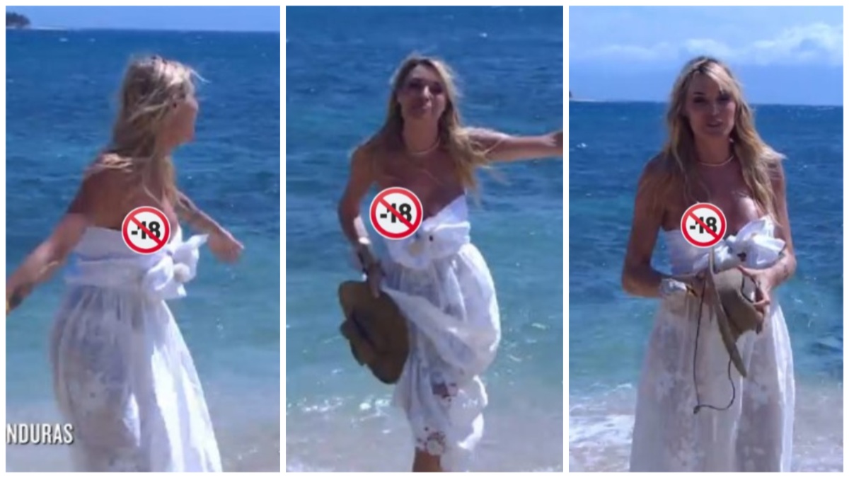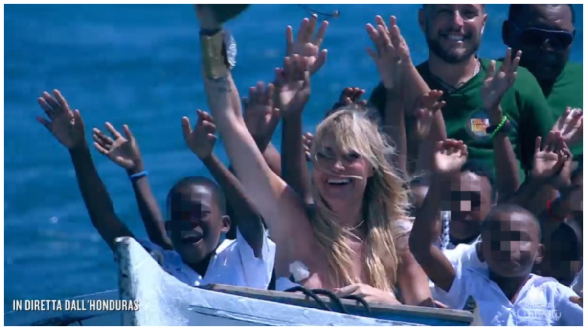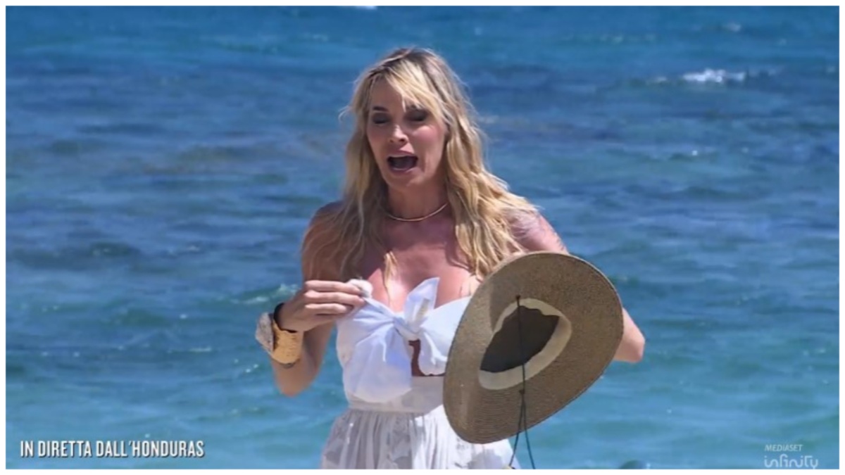 “Sono arrivata con lo scuolabus, quello che tra l’altro hai preso tanto tempo fa proprio tu, su quest’isola, in Honduras – ha sottolineato Elenoire Casalegno – Alcuni di questi bimbi sono i figli di quelli che viaggiarono con te. Ti ricordi?”. “Mi stai dando della vecchia praticamente”, ha ironizzato Vladimir Luxuria. “Assolutamente no. Giammai. Scendo? Sbarco?”, ha domandato l’inviata. Una volta approdata sulla terraferma, il vestito bianco senza spalline ha tradito la bella inviata che, mentre si sbracciava per salutare i bimbi del posto, è andata fuori di seno. L’inviata ha cercato di coprirsi con il grande cappello che teneva tra le mani ma ormai la frittata era fatta.