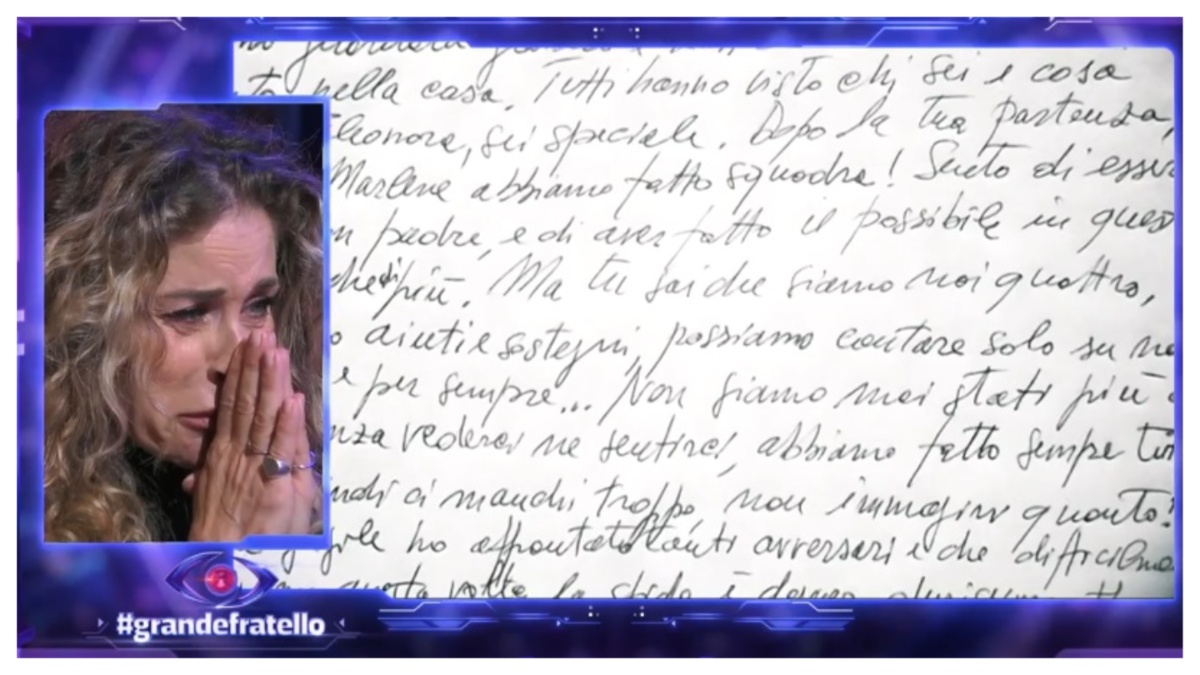 “Qualche settimana fa tu hai incontrato le tue bambine. Però succede che a volte gli affetti tornano a bussare alla porta. C’è qualcuno che ha voluto indirizzarti delle parole molto importanti”, ha detto Alfonso Signorini ad Eleonora Cecere. Il marito Luigi le ha inviato una lettera. “Amore mio, per troppo tempo ho potuto solo guardarti – recitava la missiva – Non sai quante volte avrei dato tutto quello che avevo solo per sfiorati un istante. Il ‘Grande Fratello’ era il tuo sogno, una promessa fatta a te stessa e l’hai realizzata. Pur sapendo che sarebbe stata dura, non ti avrei mai potuto negare questo e ho fatto il tifo per te”.