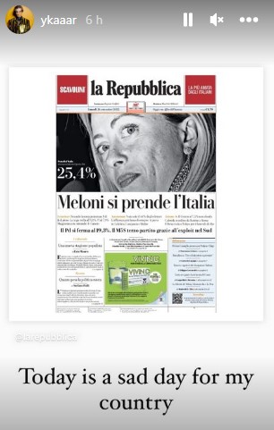 “Il treno viaggia in orario. Nuova era”, scrive alludendo al luogo comune secondo cui, in epoca fascista, “con Mussolini i treni erano sempre in orario”. “Oggi è un giorno triste per il mio paese”, cinguetta invece Damiano David. Il leader dei Maneskin posta un titolo della CNN che asserisce che “Giorgia Meloni sarà la Prima Ministra più di estrema destra dai tempi di Mussolini”. “Siamo esattamente quello che ci meritiamo”, sentenzia Eros Ramazzotti.