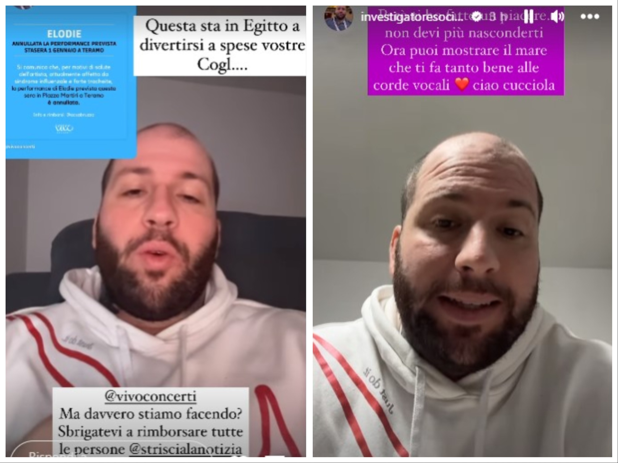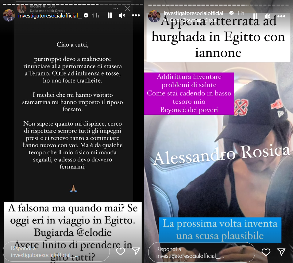 Oggi a mettere in dubbio l’indisposizione dell’artista è Alessandro Rosica. Il gossipparo, noto anche come Investigatore Social, avrebbe ricevuto una serie di segnalazioni secondo cui dopo l’annuncio dell’annullamento del concerto di Teramo, Elodie sarebbe partita alla volta dell’Egitto. La cantante sarebbe andata in vacanza a Hurghada insieme al fidanzato Andrea Iannone che la notte di San Silvestro era con lei a Palermo.