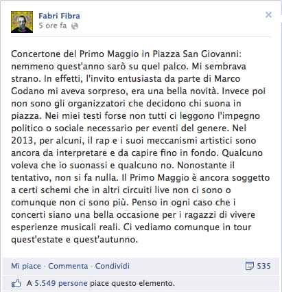 Fabri Fibra non salirà sul palco del concertone del Primo Maggio. La decisione presa dai sindacati confederali, organizzatori dello show che va in scena ogni anno in piazza San Giovanni, arriva a seguito delle accuse mosse al rapper dall’associazione D.i.re (Donne in rete contro la violenza). Le canzoni dell’interprete italiano, che spopola tra i giovanissimi, conterebbero infatti messaggi sessisti e misogini. Due, in particolare, i testi sotto accusa: “Su le mani” in cui fa riferimento alla misteriosa serie di omicidi che sconvolsero Firenze negli anni ‘80 e “Venerdì 17” in cui viene descritto lo stupro e l’omicidio di una bambina di 12 anni, esaltando la violenza contro le donne. Nel giorno dell’esclusione, il rapper fa ricorso a facebook per dire la sua.