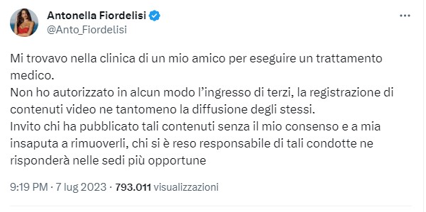 Dopo aver appreso che Fabrizio Corona aveva pubblicato il video sul suo canale Telegram, Antonella Fiordelisi si è vista costretta ad intervenire. “Mi trovavo nella clinica di un mio amico per eseguire un trattamento medico – ha scritto su Twitter – Non ho autorizzato in alcun modo l’ingresso di terzi, la registrazione di contenuti video né tantomeno la diffusione degli stessi. Invito chi ha pubblicato tali contenuti senza il mio consenso e a mia insaputa a rimuoverli, chi si è reso responsabile di tali condotte ne risponderà nelle sedi più opportune”.
