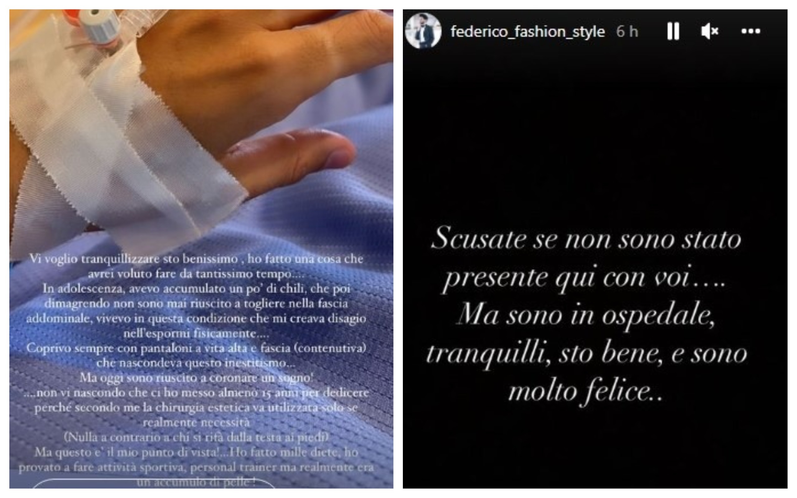 “Scusate se non sono stato presente qui con voi… ma sono in ospedale – ha detto – Tranquilli, sto bene e sono molto felice”. “Vi voglio tranquillizzare sto benissimo – ha ribadito – Ho fatto una cosa che avrei voluto fare da tantissimo tempo. In adolescenza, avevo accumulato un po’ di chili, che poi dimagrendo non sono mai riuscito a togliere nella fascia addominale, vivevo in questa condizione che mi creava disagio nell’espormi fisicamente”.