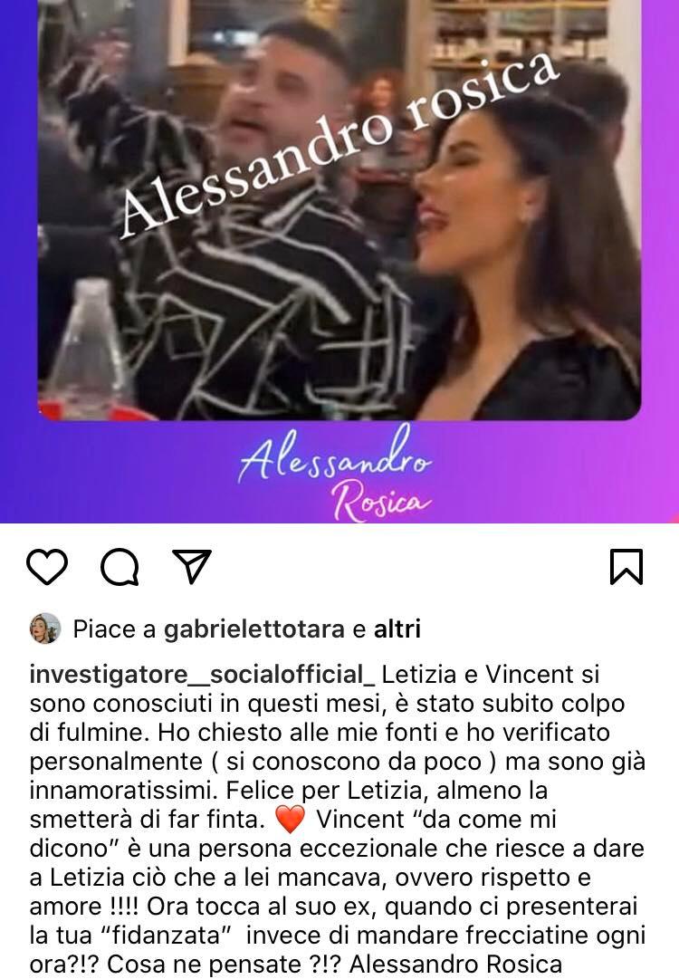 A confermare la liaison è il gossiparo Alessandro Rosica: “Letizia e Vincent si sono conosciuti in questi mesi, è stato subito colpo di fulmine. Ho chiesto alle mie fonti e ho verificato personalmente (si conoscono da poco) ma sono già innamoratissimi (…) Vincent ‘da come mi dicono’ è una persona eccezionale che riesce a dare a Letizia ciò che a lei mancava, ovvero rispetto e amore”.