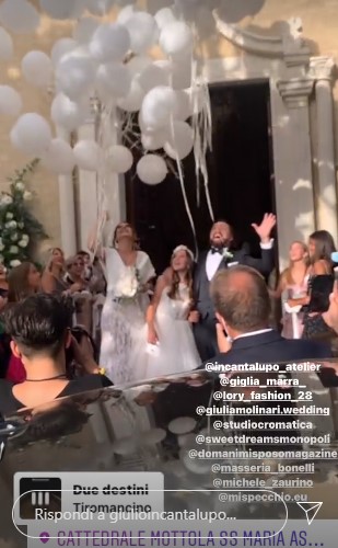 Dopo la cerimonia religiosa, i festeggiamenti sono proseguiti in una masseria immersa nel bosco delle Murge dove gli sposi hanno accolto 170 ospiti. Il ricevimento si è svolto all’aperto nel rispetto delle norme anticovid. Il menù era a base di pesce con l’aggiunta di orecchiette e mozzarelle sfornate al momento dalla masseria.