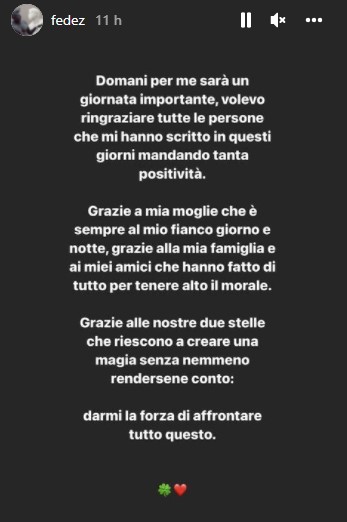 Volevo ringraziare tutte le persone che mi hanno scritto in questi giorni mandando tanta positività – ha aggiunto – Grazie a mia moglie che è sempre al mio fianco giorno e notte, grazie alla mia famiglia e ai miei amici che hanno fatto di tutto per tenere alto il morale”. Fedez si è poi rivolto ai suoi figli, Leone e Vittoria: “Grazie alle nostre due stelle che riescono a creare una magia senza nemmeno rendersene conto: darmi la forza di affrontare tutto questo”. Chiara Ferragni ha condiviso la Instagram Story del marito.