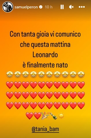 Fiocco azzurro a “Ballando con le stelle”. L’insegnante di danza Samuel Peron è diventato padre per la prima volta. Ad annunciarlo è stato lui stesso con una Instagram Story. “Con tanta gioia vi comunico che questa mattina Leonardo è finalmente nato”, ha scritto. Il bimbo è frutto del suo amore per l’attrice Tania Bambaci al suo fianco da nove anni.